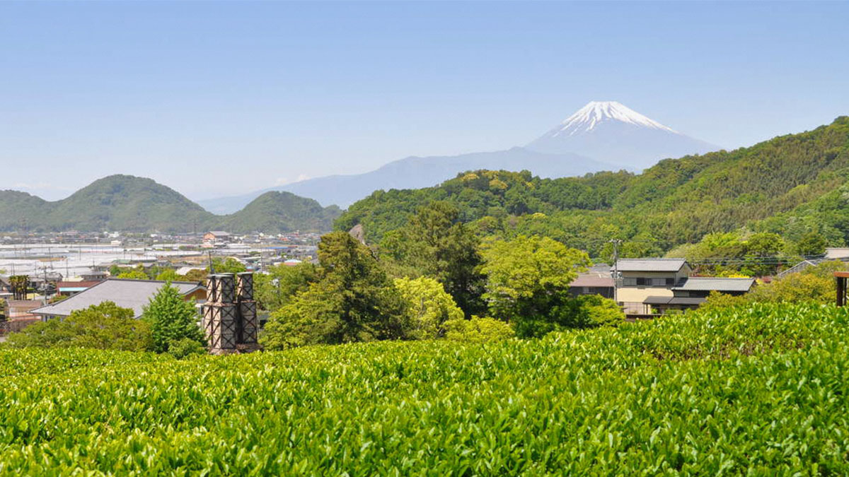 蔵屋鳴沢の茶畑から見えるW世界遺産。2013年に世界遺産登録された富士山、2015年に世界遺産登録された韮山反射炉という二つの世界遺産を同時に見られるのは伊豆の国市だけです。