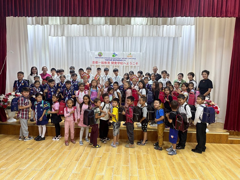 また、市ではこの春不要になったランドセルを募り、卒業生から43個のランドセルを譲り受けました。今回の訪問でそのランドセルをソンギノハイルハン区ホグジル総合学校の新1.2年生に贈呈しました。贈呈式ではホグジル総合学校の生徒らが踊りや歌、演奏を披露し、伊豆の国市訪問団を歓迎してくれました。