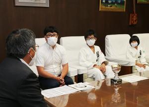 5月9日に藤枝市で行われた「第18回静岡県小学生学年別柔道大会兼全国小学生学年別柔道大会県予選」6年生男子65kg級で優勝した神田琉空(りく)君、5年生女子40kg以下級で優勝した伊東柚葉(ゆずは)さん(いずれも韮山南小、韮山柔道教室)が、伊豆長岡庁舎を訪れ、山下市長に結果を報告しました。